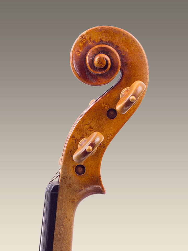 Feine italienische Geige von Luca Maria Gallo aus dem Jahr 2006. Der Korpus des Instruments ist aus Fichtenholz aus dem Val di Fiemme und aus Ahorn aus Montenegro gefertigt. Die obere Decke besteht aus zwei Teilen mit sehr breiten Jahrringen, von 1 mm bis 3,5 mm Breite an einigen Stellen. Die untere Decke besteht aus einem ganzen Ahronstück (Vogelauge). Der Korpus sowie das gesamte Instrument ist mit einem ÖlLack in einem golden-braunen Farbton überzogen. Die Lackierung ist in einem antiken Stil ausgeführt. Das Instrument wurde von Luca Maria Gallo in Cremona im Jahr 2006 gebaut, wie das Original-Etikett bestätigt. Die Korpuslänge beträgt 356 mm, die Mensur 195 mm.